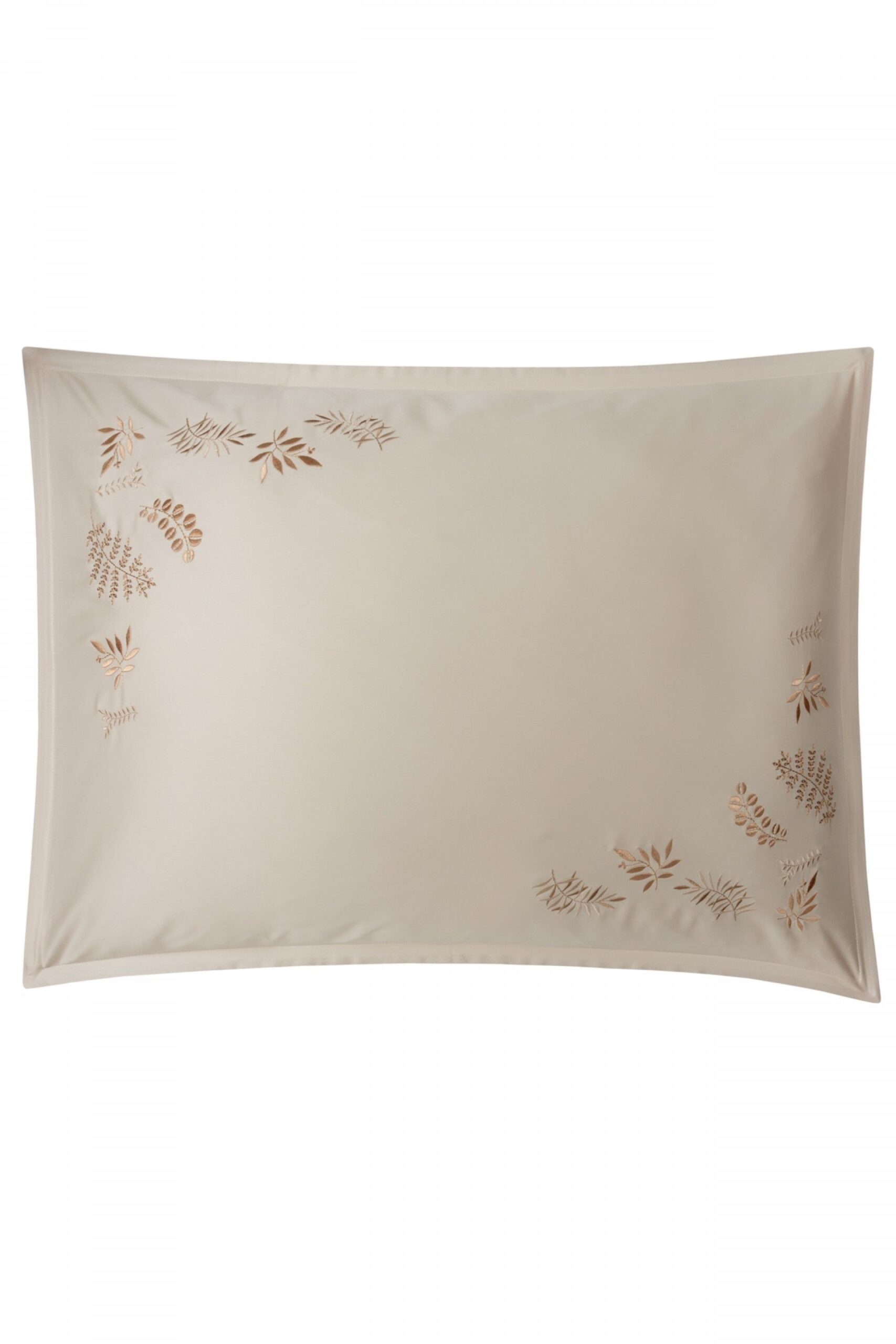 Дизайн наволочки украшен нежной вышивкой в природных мотивах с элементами веток и листьев по углам. Нейтральный бежевый цвет придаёт постельному белью изысканный вид, и оно легко вписывается в любой стиль интерьера, от классического до современного.